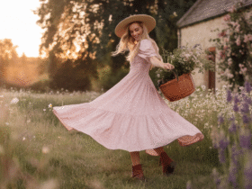 To recreate this fairy-tale look, start with a lace-trimmed blouse or a ruffled peasant top in a soft pastel shade. Pair it with a flowing midi skirt in complementary tones or white denim for a more casual twist. Layer on a cropped denim jacket or a romantic shawl if the weather calls for it. Finish with delicate gold jewelry, a flower crown or floral hair clips, and ballet flats or strappy sandals. The key to pulling this off without looking costume-y is balancing the sweetness with one grounded element – like that denim jacket or more structured shoes. This outfit is perfect for garden parties, romantic dates, or anytime you want to feel like you stepped out of a fairytale!