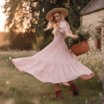 To recreate this fairy-tale look, start with a lace-trimmed blouse or a ruffled peasant top in a soft pastel shade. Pair it with a flowing midi skirt in complementary tones or white denim for a more casual twist. Layer on a cropped denim jacket or a romantic shawl if the weather calls for it. Finish with delicate gold jewelry, a flower crown or floral hair clips, and ballet flats or strappy sandals. The key to pulling this off without looking costume-y is balancing the sweetness with one grounded element – like that denim jacket or more structured shoes. This outfit is perfect for garden parties, romantic dates, or anytime you want to feel like you stepped out of a fairytale!