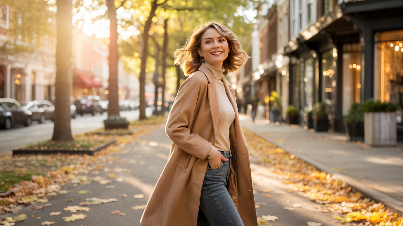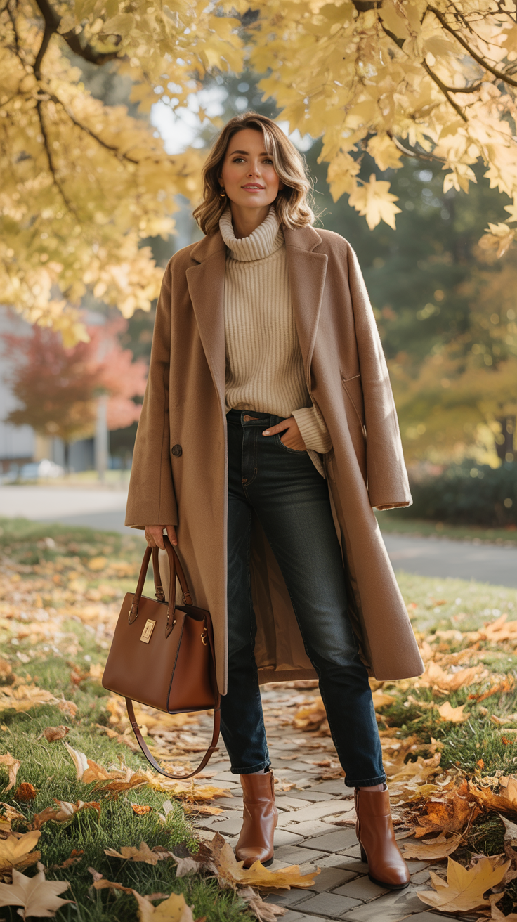 This timeless look centers around a luxurious camel or tan overcoat paired with neutral basics underneath. The silhouette is clean and sophisticated, featuring a structured coat that hits mid-thigh or knee-length, worn over slim-fit jeans or tailored trousers and a simple white or cream turtleneck. The color palette stays within the warm neutral family—think camel, ivory, beige, and chocolate brown—creating a monochromatic effect that’s incredibly elegant and seasonally appropriate.