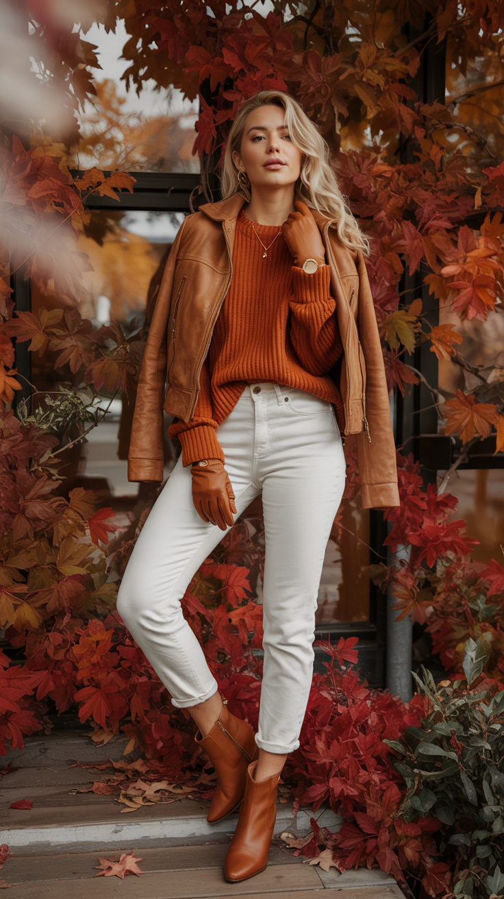 To make white jeans work for autumn, pair them with a chunky knit sweater in a fall color like burnt orange, mustard, or forest green. Layer with a leather or suede jacket in brown or tan, and add cognac or brown ankle boots. The warm tones and textures of your top layers will make the white jeans feel seasonally appropriate rather than summery. Accessorize with a brown leather belt, handbag, and gold jewelry to tie everything together. This look is perfect for those early fall days when it’s not quite cold enough for dark, heavy pieces but summer’s brightness feels out of place.