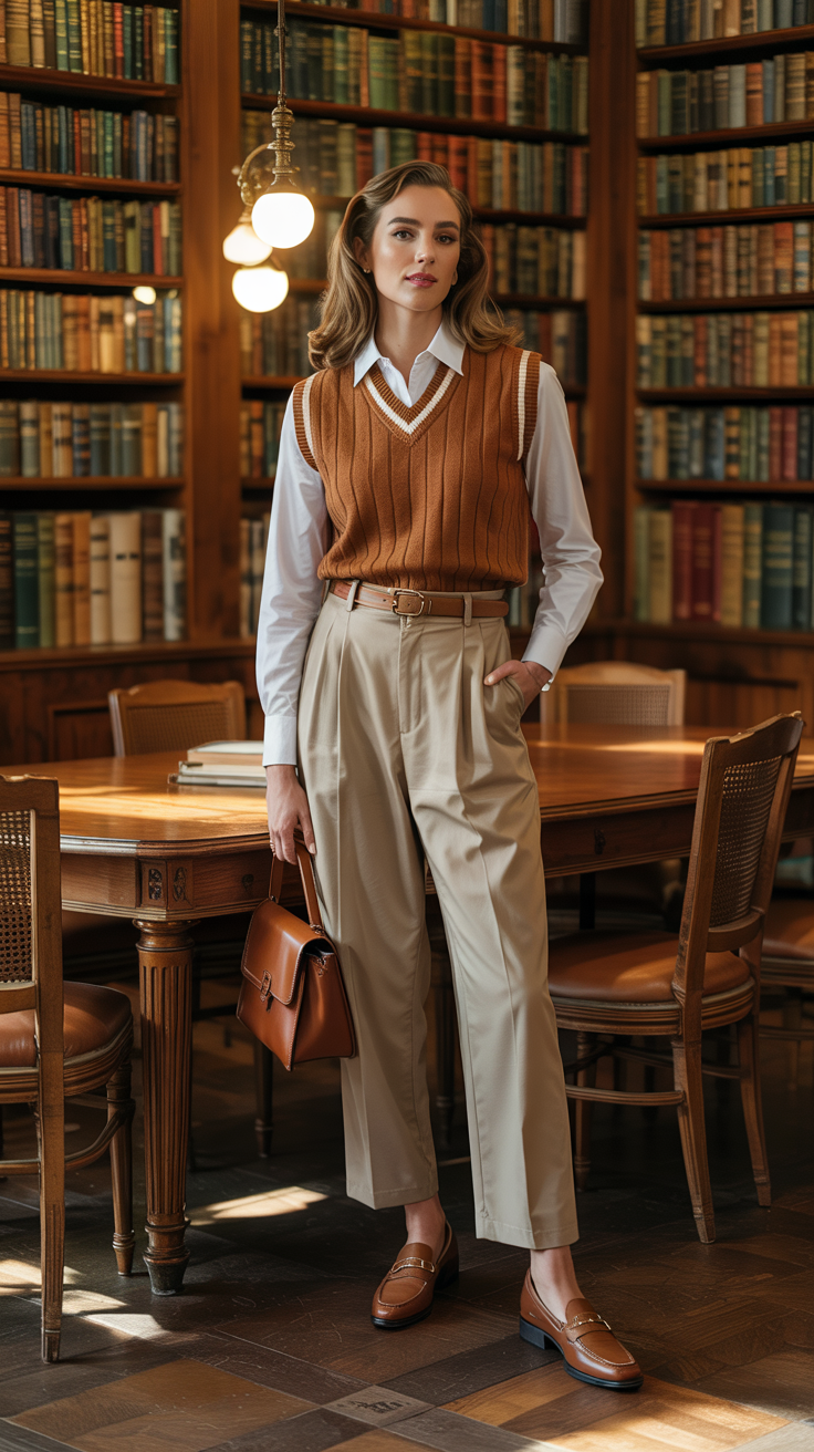 To recreate this look, start with a classic button-down shirt in white, cream, or light blue, and layer a knit sweater vest over it. Choose a vest in a fall-appropriate color like caramel, sage green, or rust, and pair with high-waisted trousers, a pleated skirt, or dark denim jeans. Add loafers, Mary Janes, or ankle boots to complete the preppy vibe. You can tuck in the shirt for a more polished look or leave the collar and cuffs visible for that signature layered effect. Finish with simple stud earrings and a vintage-inspired handbag to lean into the nostalgic aesthetic.