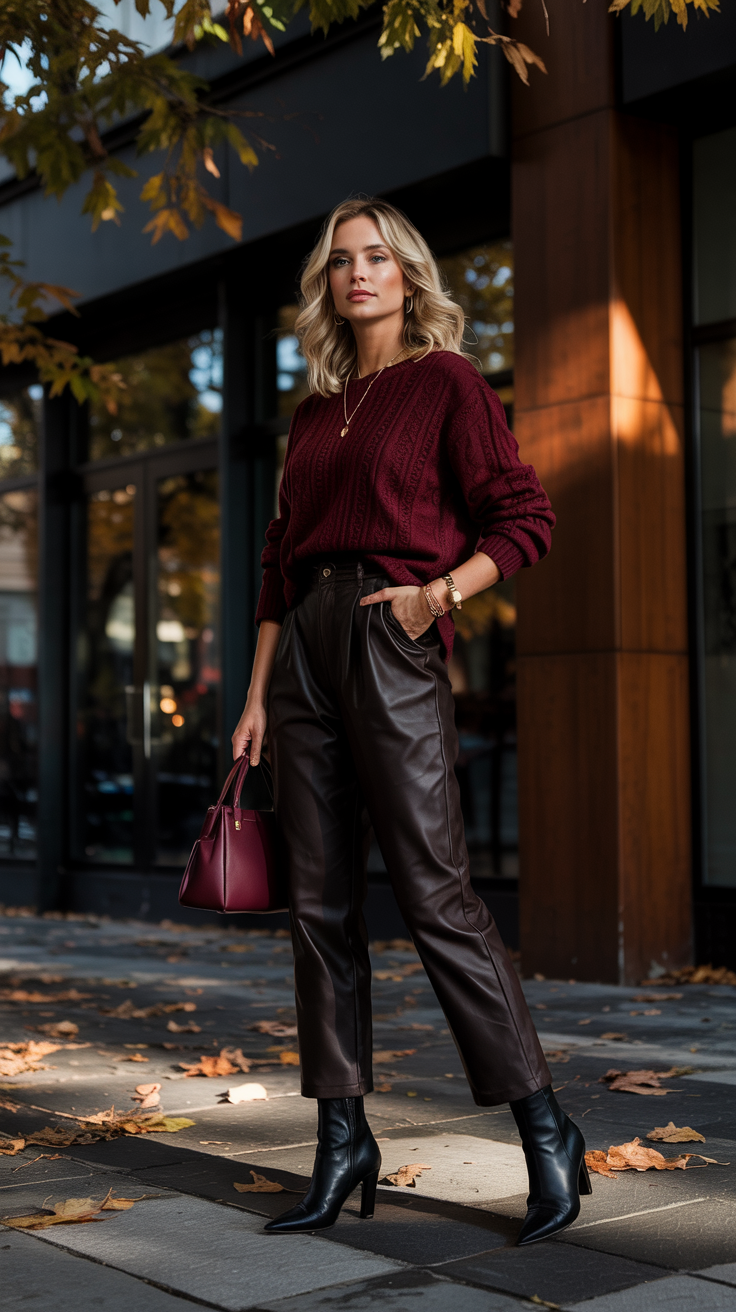This outfit idea plays with the drama of deep burgundy against the sleekness of black for a look that’s both moody and refined. Picture a rich burgundy sweater or blouse tucked into high-waisted black trousers or a leather skirt, creating a striking color contrast that feels perfect for fall. The burgundy can range from wine to oxblood, and the texture mix between soft knits and structured bottoms adds visual interest while keeping the silhouette balanced and modern.