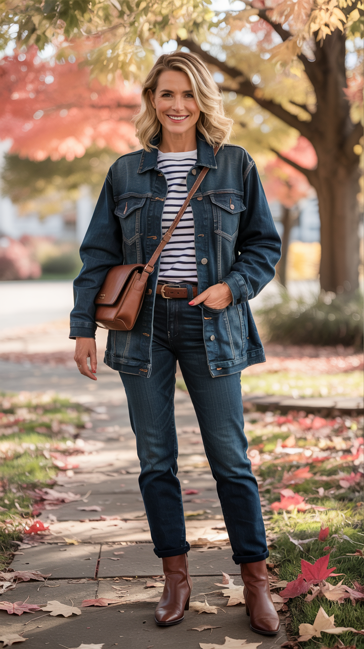 To make this work, pair a denim jacket with jeans in either a matching wash for a streamlined look or contrasting washes (like light jacket with dark jeans) for more visual interest. Layer a simple white tee, striped shirt, or neutral sweater underneath to break up the denim. Add brown leather boots or white sneakers, and accessorize with a leather belt and crossbody bag. The trick is keeping the rest of your look simple so the denim pairing becomes the focal point. For fall specifically, consider darker washes or even corduroy pieces to add seasonal weight and texture.
