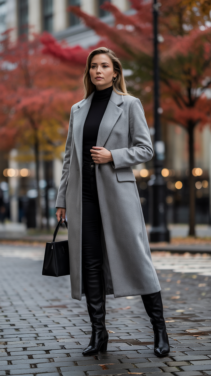 The long coat and boots combination is a classic fall formula that never fails to look elegant and polished. This look features a wool or cashmere coat that hits below the knee, paired with knee-high or over-the-knee boots for a streamlined silhouette. The color palette typically includes neutrals like black, gray, camel, or navy for the coat, with boots in matching or complementary tones. The long lines create a sophisticated, elongated appearance that’s both practical and stylish for cooler weather.
