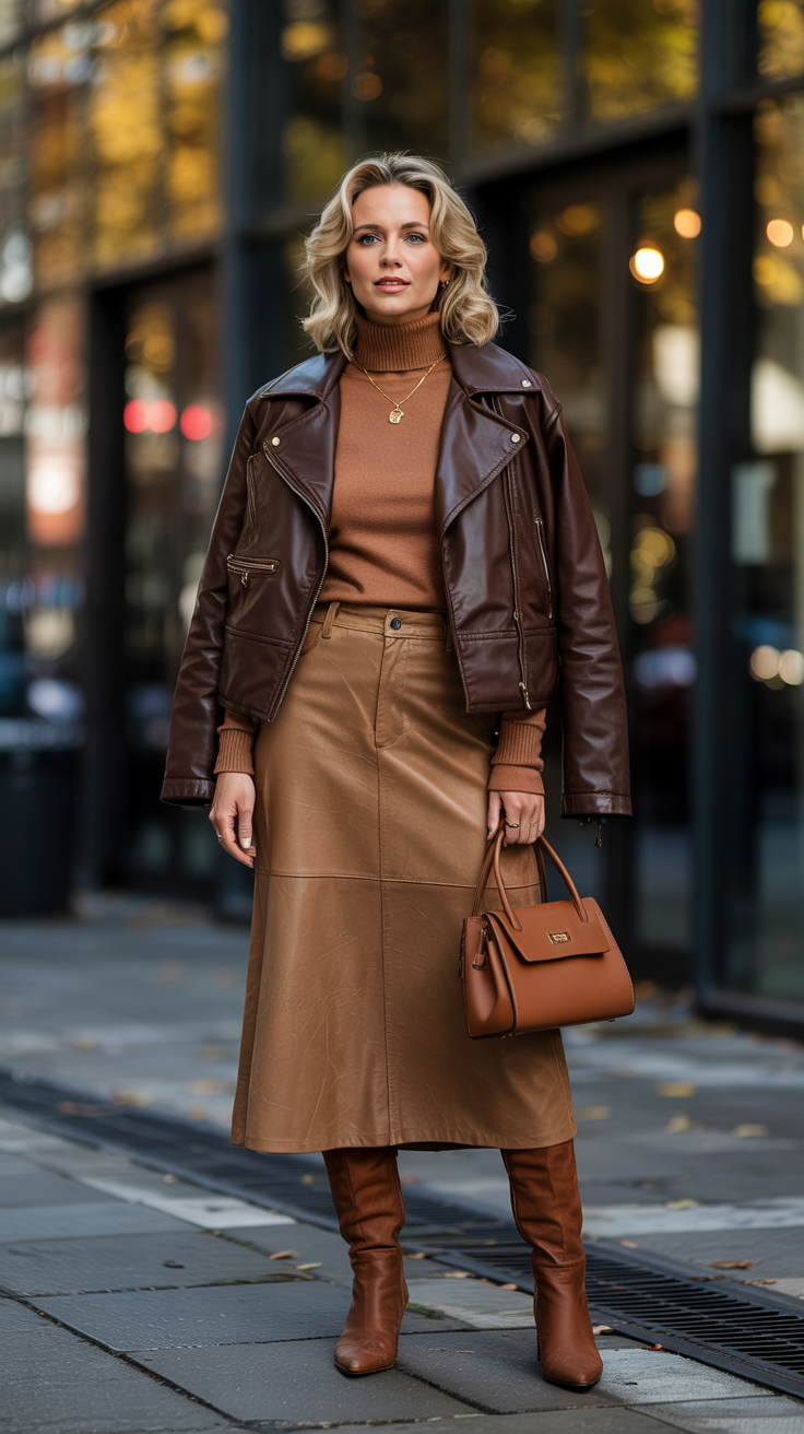 This outfit juxtaposes the edginess of a leather jacket with the femininity of a flowing midi skirt for a balanced, contemporary look. The leather jacket—whether genuine or faux—adds structure and attitude, while the midi skirt in a soft, flowing fabric creates beautiful movement and contrast. Color-wise, this typically features a black or brown leather jacket paired with skirts in fall florals, plaids, or solid colors like rust, olive, or chocolate brown.