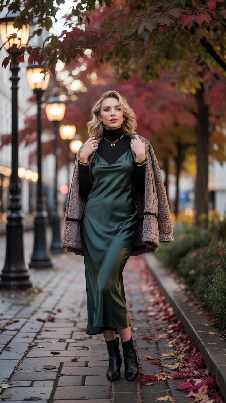 This outfit combines the elegance of a silk or satin slip dress with the coziness of knitwear for a perfect transitional fall look. The slip dress—usually in jewel tones like emerald, sapphire, or ruby, or in fall neutrals like chocolate or taupe—serves as the base, while a fitted turtleneck or long-sleeve tee layered underneath adds warmth and creates an interesting texture contrast. A chunky cardigan or denim jacket over top completes the layered look that’s both feminine and practical.