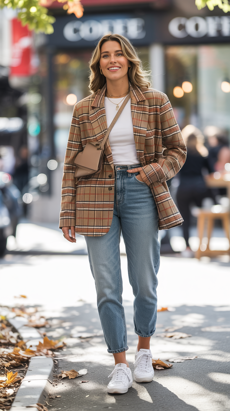 To create this outfit, find an oversized blazer that hits mid-hip or slightly longer—it should feel roomy in the shoulders but not overwhelming. Choose plaid patterns in brown and orange, herringbone in gray, or solid colors like chocolate or charcoal. Wear it open over a fitted white tee or bodysuit, and pair with high-waisted straight-leg jeans in a medium to dark wash. Add white sneakers for a casual daytime look or swap them for heeled boots to dress it up. Minimal jewelry and a crossbody bag complete the look, letting the blazer’s structure do the talking.