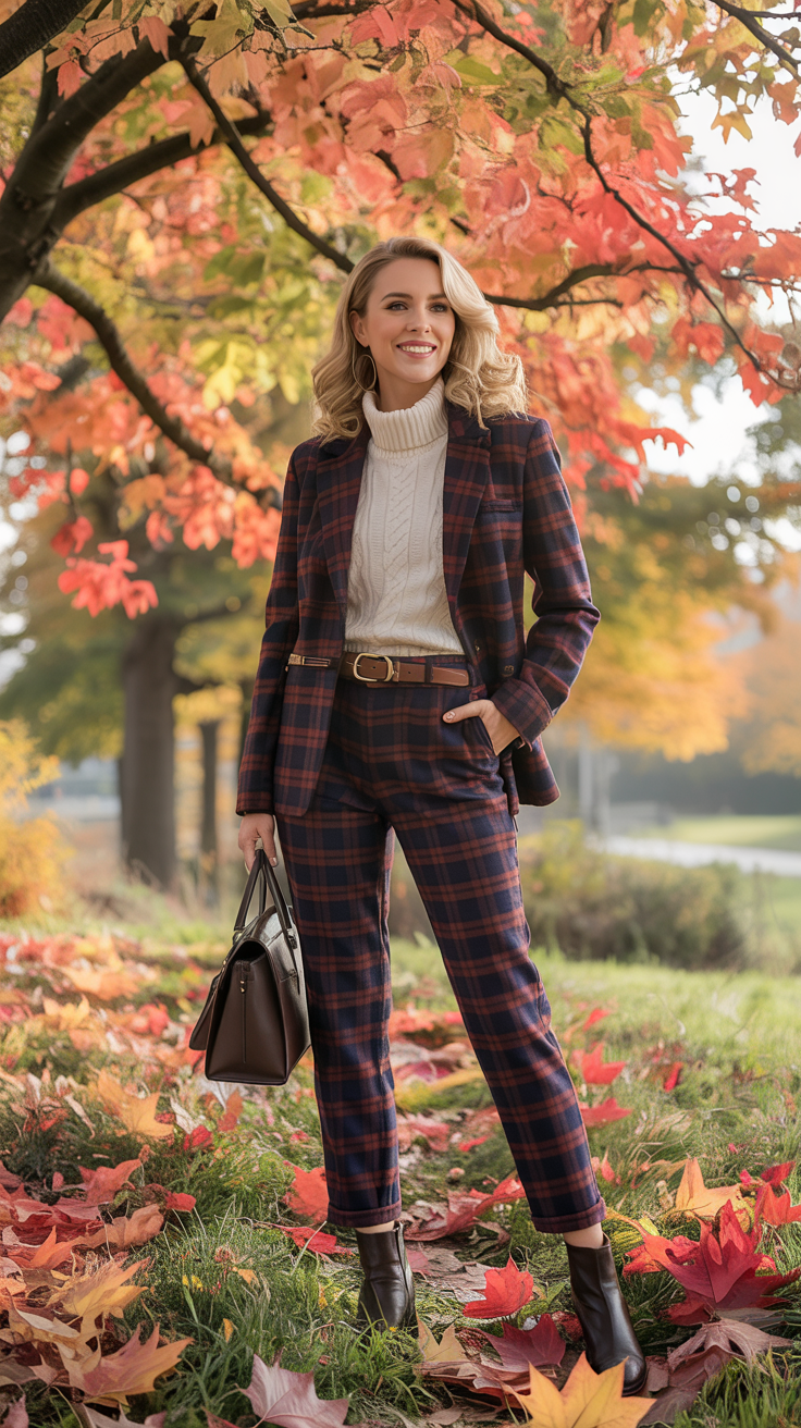 To make plaid work for fall, choose one plaid statement piece and keep the rest of your outfit simple. If you’re wearing plaid trousers, pair them with a solid-color sweater in one of the plaid’s accent colors. For a plaid blazer, wear it over a simple white tee and jeans. If you opt for a plaid shirt, tuck it into solid pants and add a leather jacket. Stick to boots—either ankle boots or combat boots—and minimal accessories to let the plaid pattern be your focal point. The key is not overdoing it; one plaid piece is usually enough to make a statement while keeping the look sophisticated rather than costume-y.