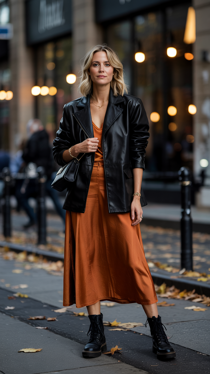 To recreate this style, start with a fitted black or cognac leather jacket and pair it with a midi-length skirt that hits mid-calf. Choose a skirt in a fall-appropriate fabric like silk, satin, or knit, in colors such as burnt orange, forest green, or a fall floral print. Tuck in a simple camisole or bodysuit to define your waist, and add ankle boots or combat boots to maintain the edge the leather jacket provides. A small crossbody bag and minimal jewelry keep the focus on the interesting contrast between tough and feminine elements. This look works beautifully for date nights, dinners out, or any occasion where you want to feel both comfortable and stylish.