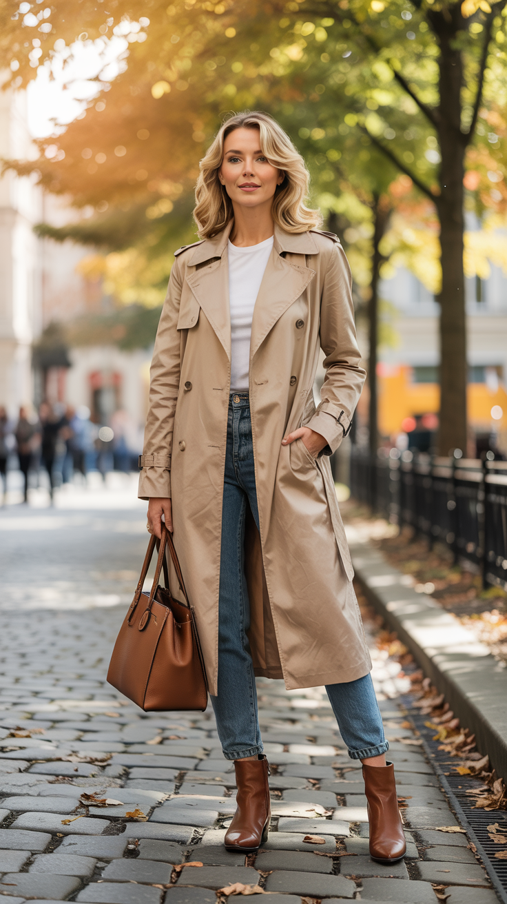The trench coat is the ultimate fall outerwear piece, offering timeless style and versatility. This look centers around a classic beige or khaki trench coat, but modern variations include black, navy, or even leather trenches. The traditional double-breasted style with a belted waist creates a flattering silhouette that works over everything from jeans and a tee to dresses and tailored pants. The neutral color makes it incredibly versatile, complementing any outfit while adding instant polish and sophistication.