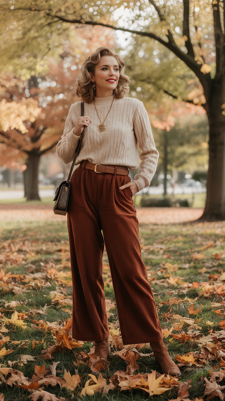 To style corduroy for fall, choose one corduroy statement piece and build around it. Corduroy wide-leg pants in rust or brown pair beautifully with a simple cream sweater and ankle boots. A corduroy jacket in camel looks great over a striped tee and jeans. A corduroy mini or midi skirt in forest green works with a tucked-in turtleneck and tights. Keep your other pieces simple and let the corduroy texture be the star. Add complementary accessories like a leather belt, suede bag, and gold jewelry. The key is embracing the vintage, nostalgic feel of corduroy while keeping the overall look modern and fresh.