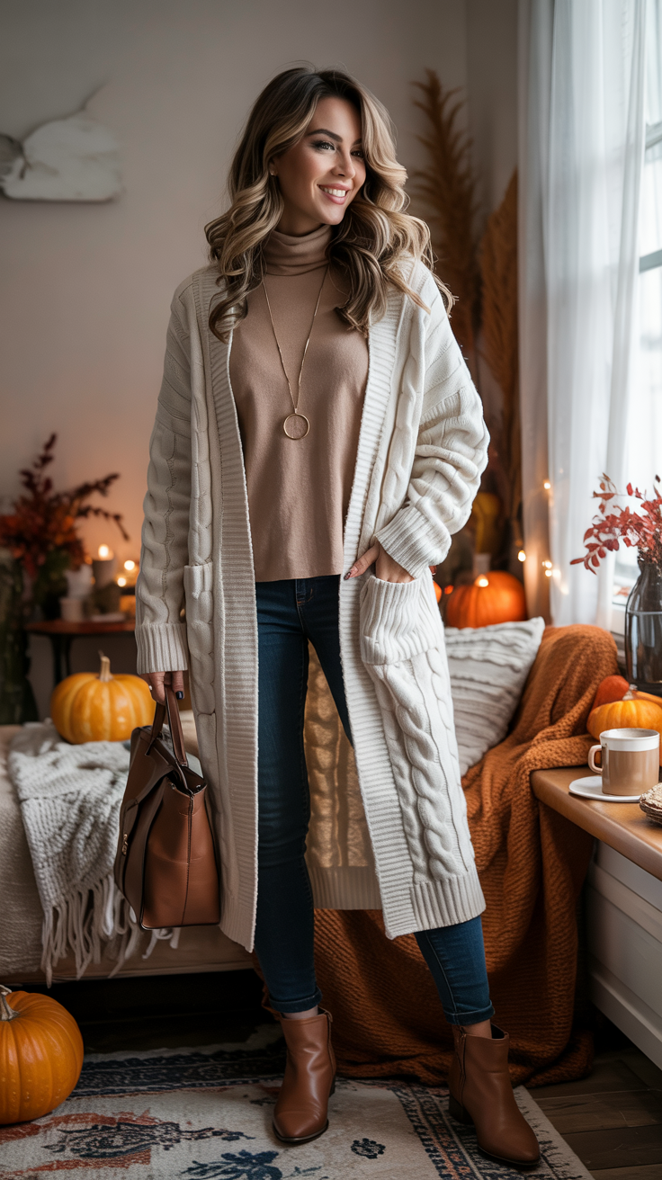 The oversized, chunky knit cardigan has become a fall staple, offering the ultimate in cozy comfort while still looking put-together. This look centers around a long, thick cardigan in cable knit or textured stitching, worn open as an outer layer. The color palette embraces fall’s warmth with shades like cream, oatmeal, camel, rust, and forest green, paired with fitted basics underneath to balance the cardigan’s volume. The overall vibe is relaxed, comfortable, and perfect for cooler autumn days.